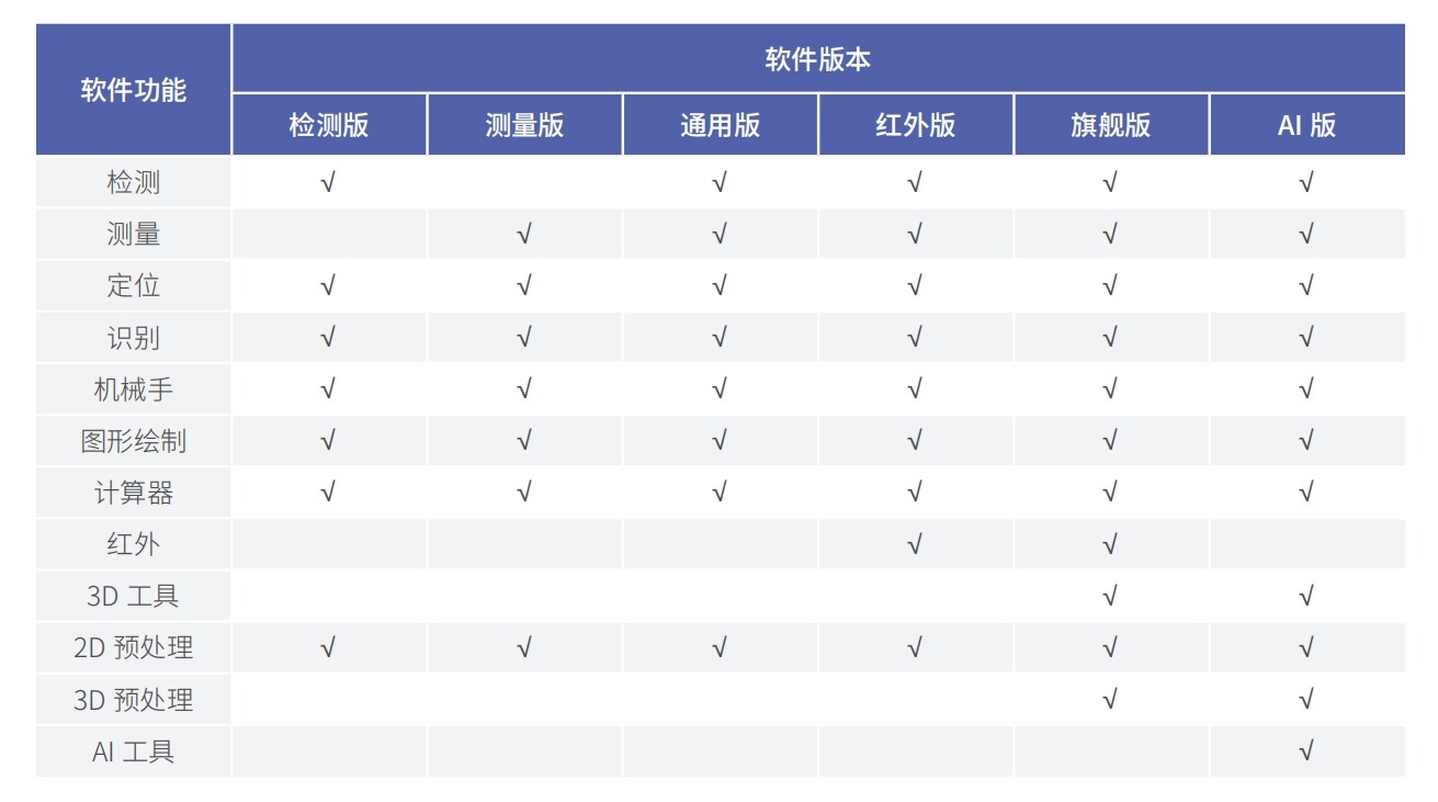 HCvisionQuick 智能软件根据功能差异分为检测版、测量版、通用版、红外版、旗舰版和 AI 版等多个版本, 各版本所含功能详见下表。